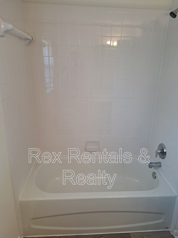 Step into the expansive living room, where soaring high ceilings and charming built-ins create an inviting atmosphere. The master suite boasts a walk-in closet and a private bathroom with a relaxing tub, offering a serene retreat. Both bathrooms have been refreshed with new plank wood grain flooring, adding warmth and style.